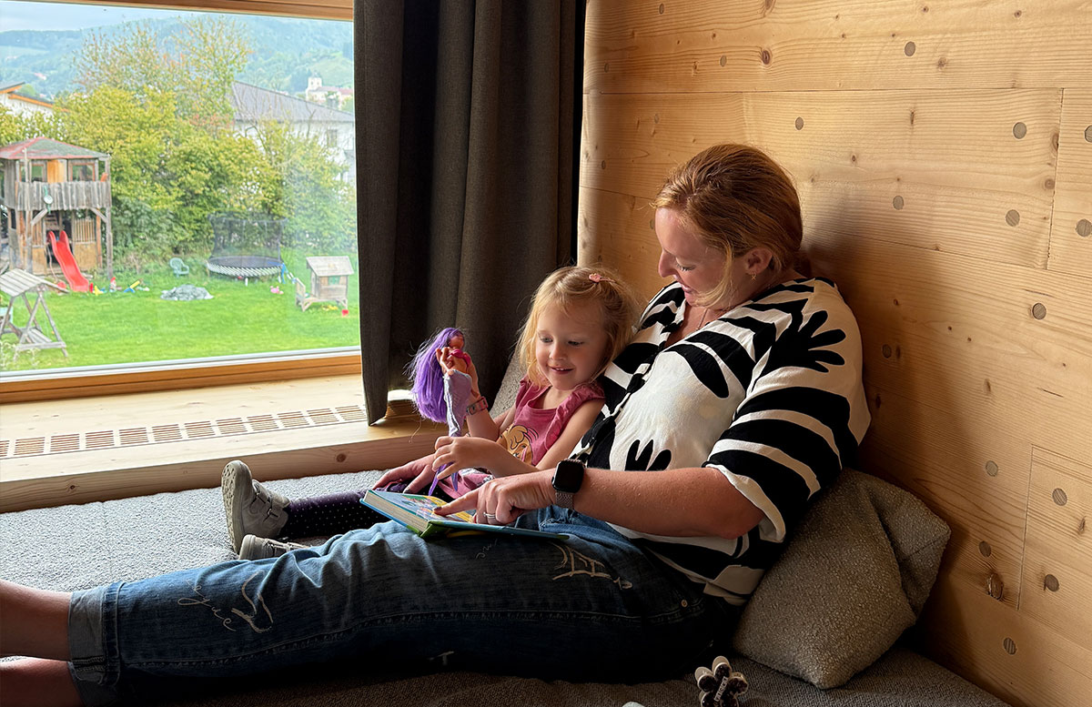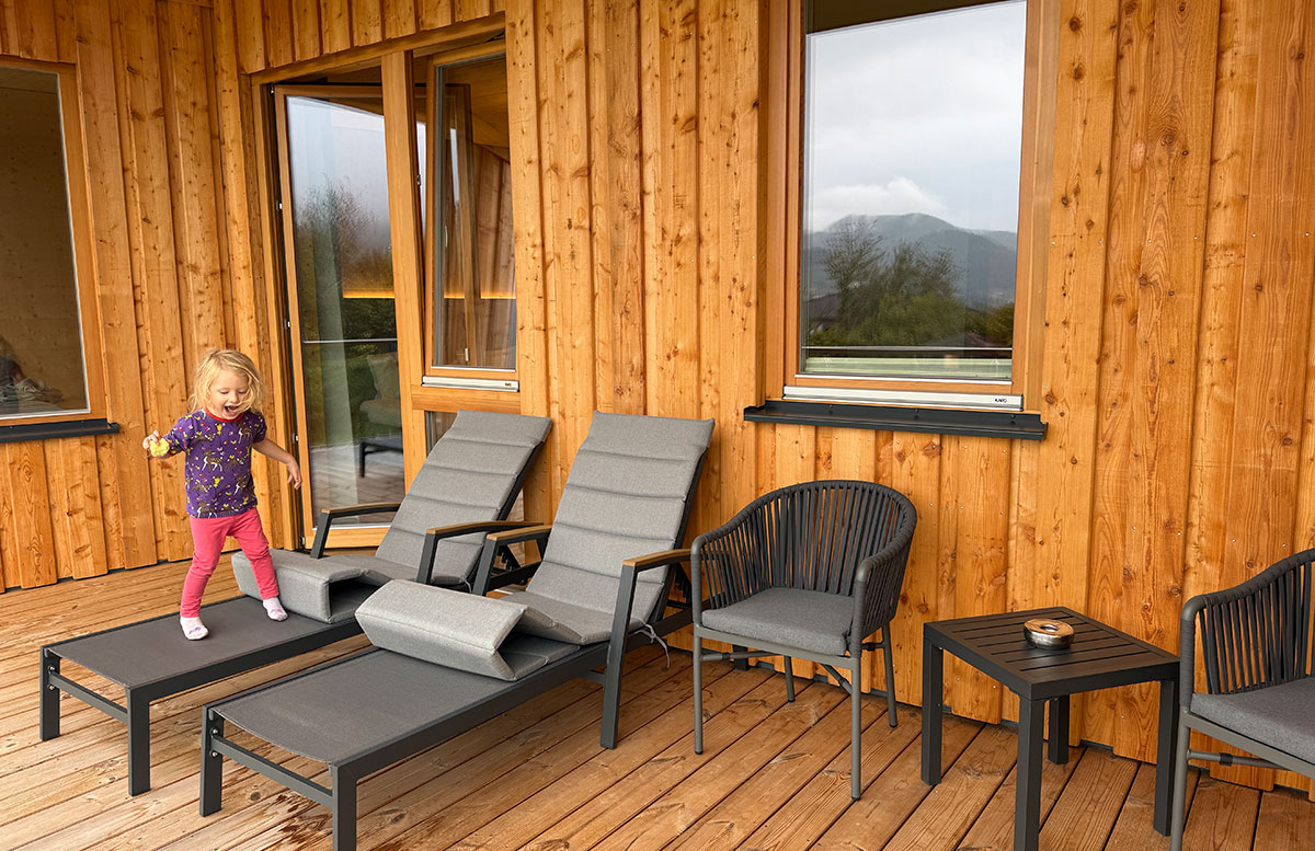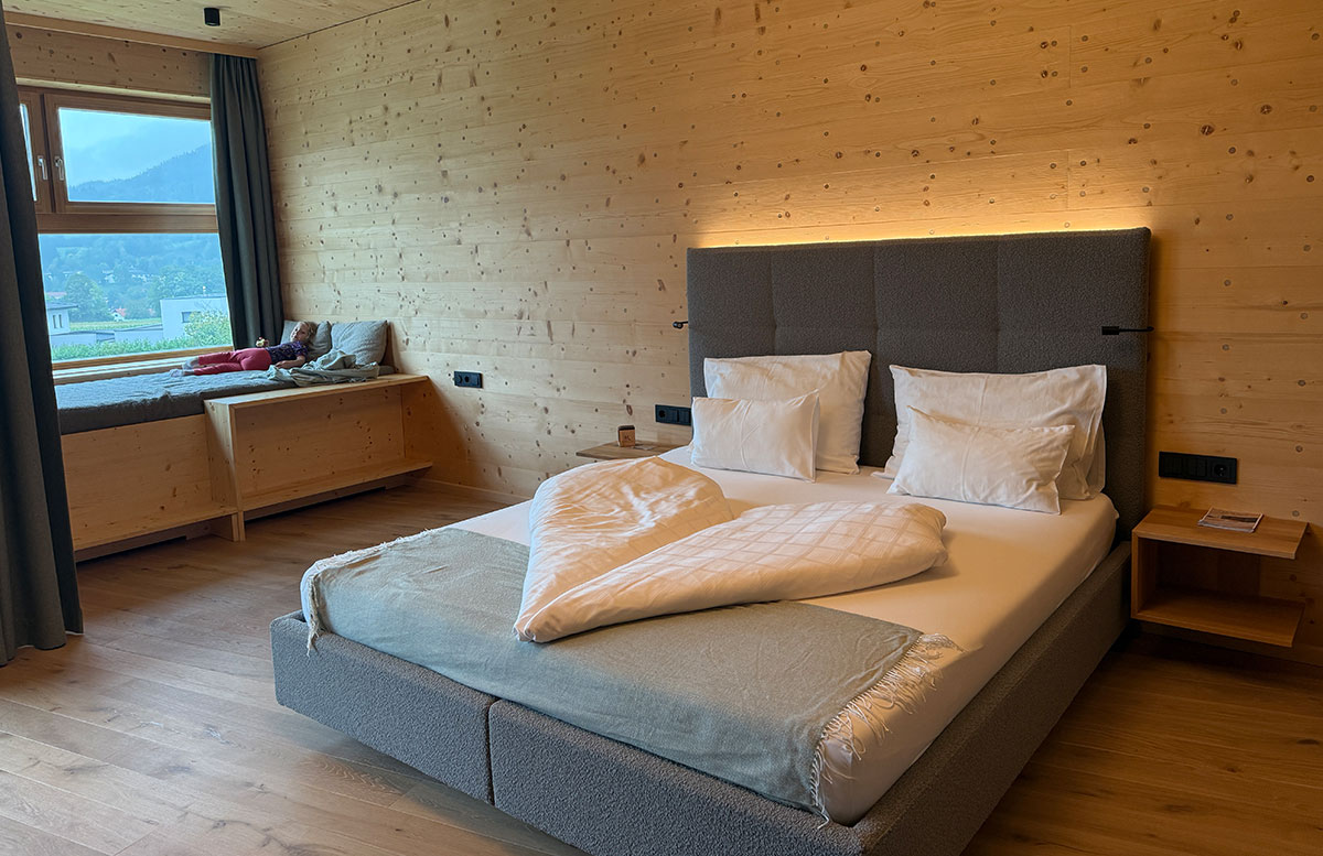 Gewohnt haben wir in einem gemütlichen Familienzimmer mit gemütlicher Leseecke beim Fenster, großem Wohn-Schlafbereich und eigenem Kinderzimmer. Da die Wohnräume aus aus natürlichen Materialien mit viel Holz erbaut wurde, ist mir sofort der angenehme Duft und das gemütliche Raumklima aufgefallen. Unser Zimmer hatte außerdem einen Balkon mit Blick ins Grüne. Bademäntel, Badetasche und Badetücher stehen für Groß und Klein bereit.