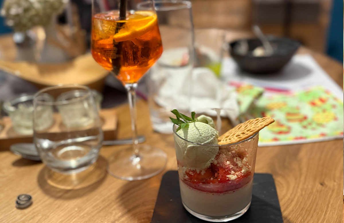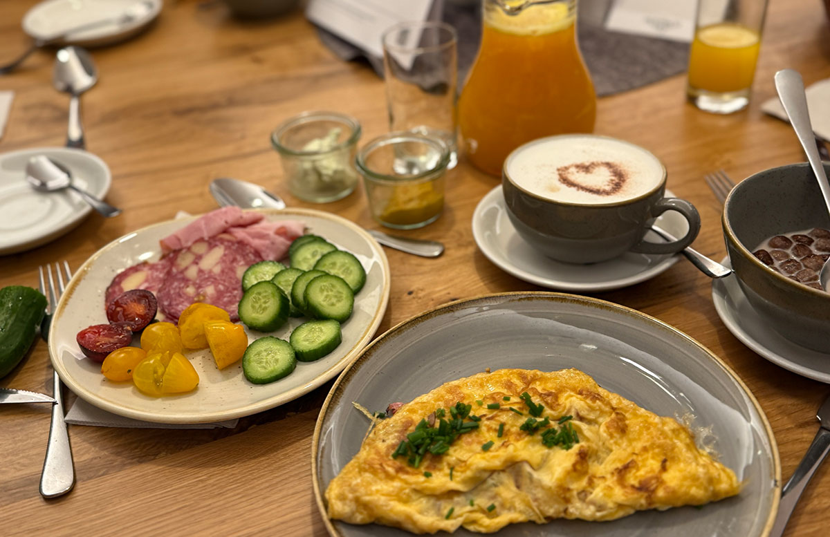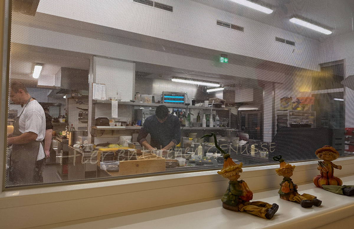 Im Molzbachhof wird eine Genusspension angeboten, die für uns perfekt war: Frühstück vom großen Buffet, nachmittags kann man sich eine Suppe und/oder Salat a la carte bestellen und abends gibt es ein mehrgängiges Wahlmenü. Die Küche legt viel Wert auf regionale und saisonale Produkte, vieles stammt direkt aus dem hauseigenen Garten oder von Bauern aus der Umgebung. Für Kinder gibt es eine eigene Karte. Toll finde ich auch die Schauküche, so kann man den Köchen beim Zubereiten der Gerichte zusehen.